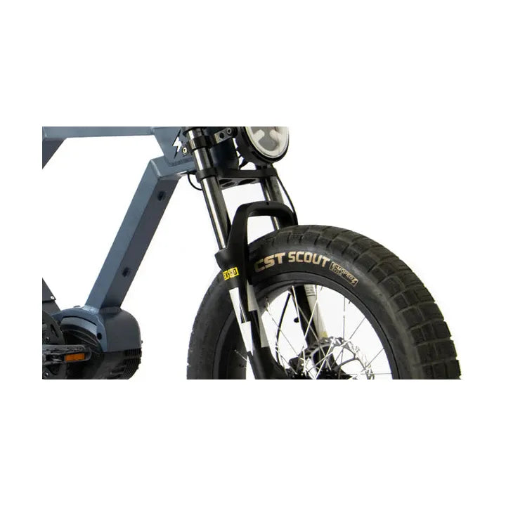 The Flash's front suspension fork features 80mm of travel, compression adjustment and lockout. It effectively absorbs most of the jarring bumps and shocks. The front fork is made for smooth rides on rugged routes & terrains.