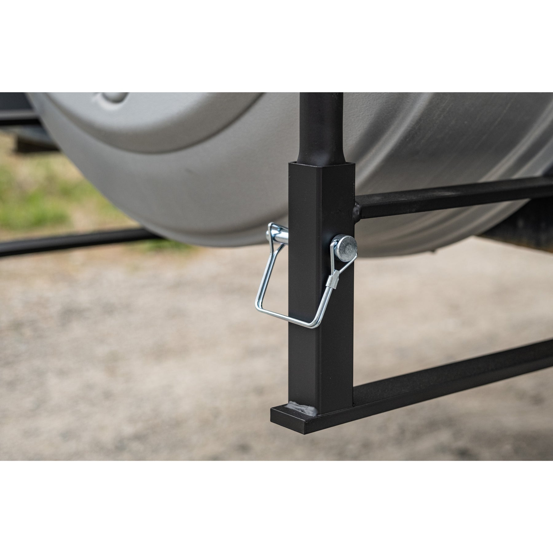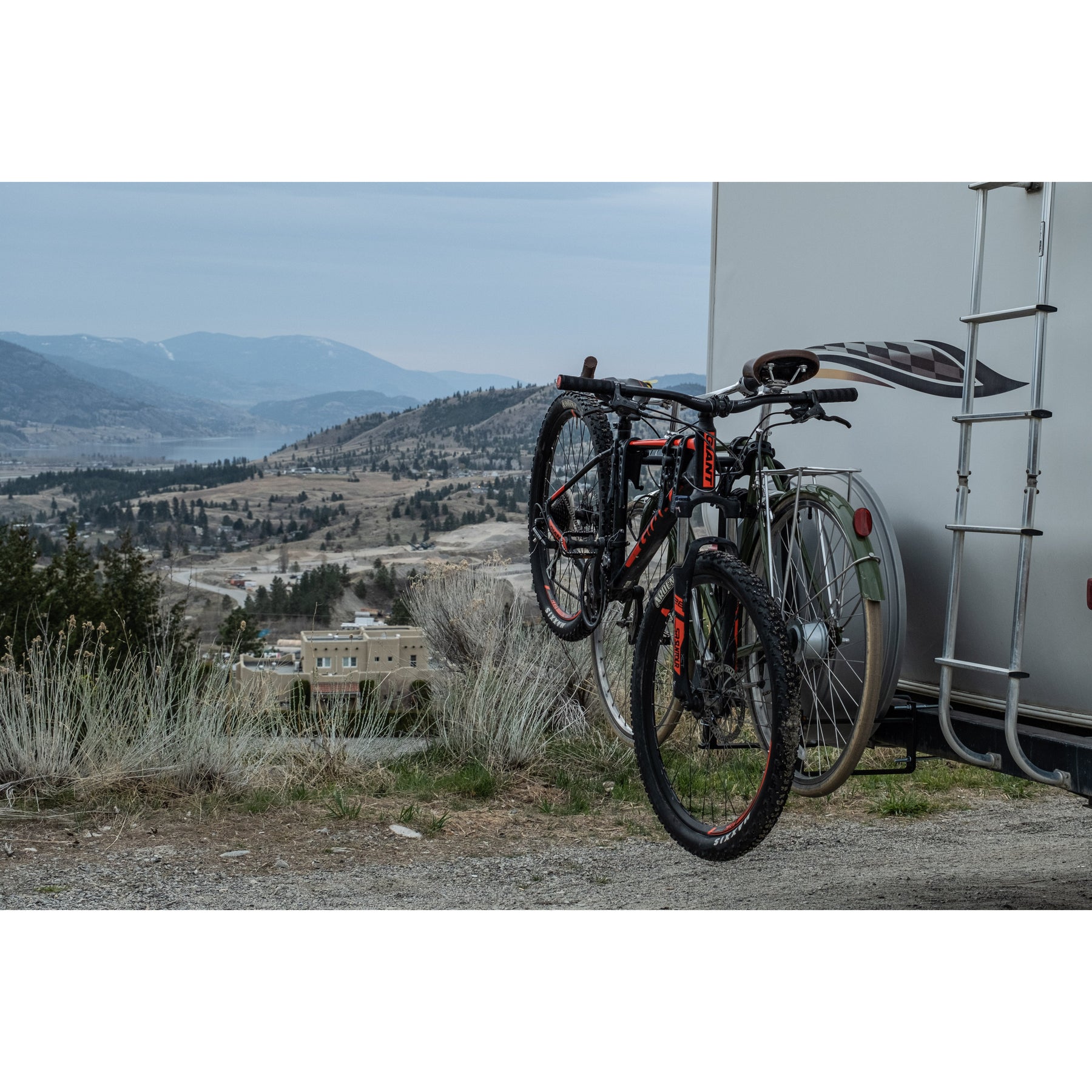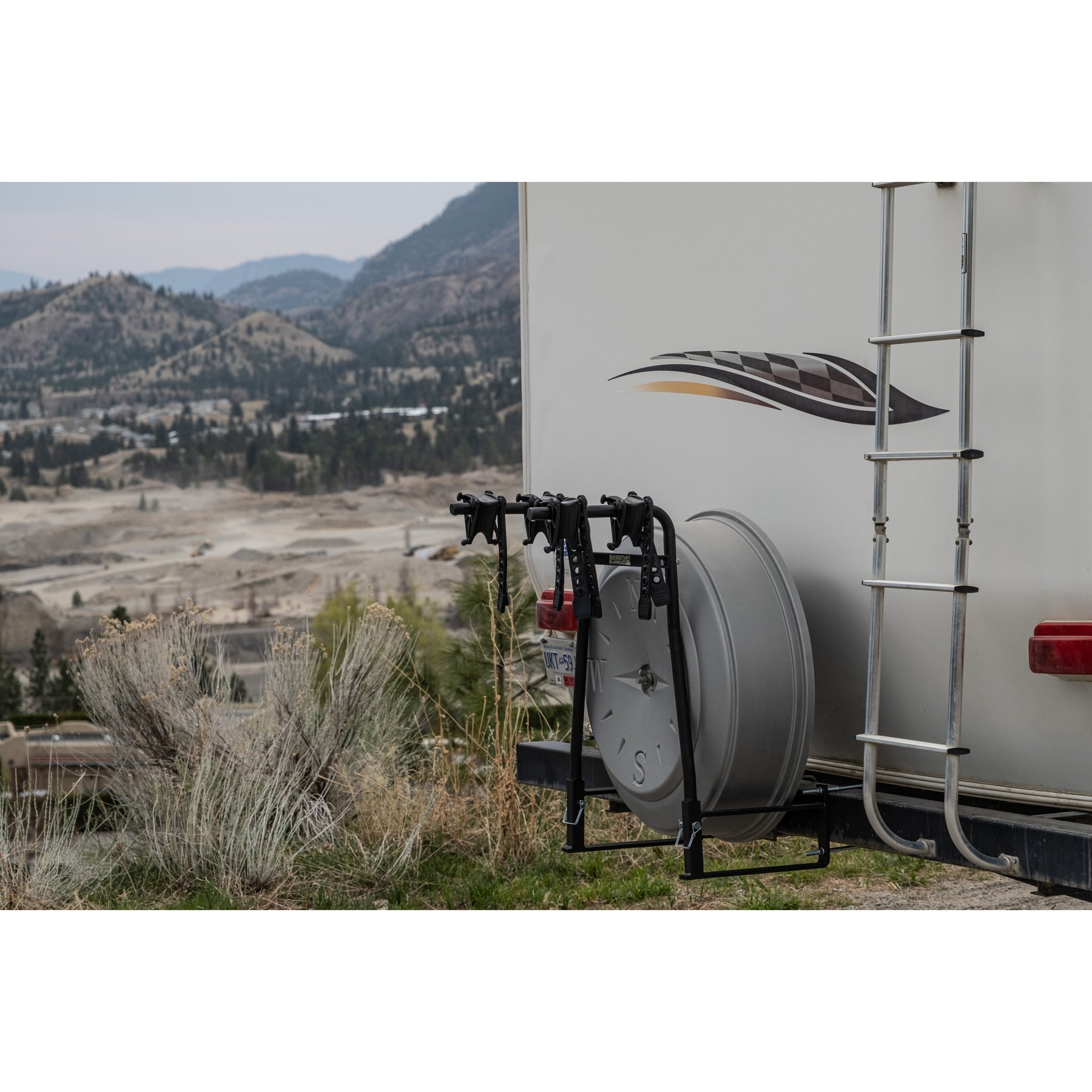 The Swagman AROUND THE SPARE DELUXE is a unique bike rack which enables you to carry two bikes and keep the spare tire on your RV. Designed to fit around a 4” - 4.5” continuously welded bumper, the AROUND THE SPARE DELUXE is RV Approved, meaning that it’s designed to handle the extra stress of being on the back of an RV. It mounts around most spare tires and the bikes’ frames are held in cradles with straps. The cradles can rotate to fit nearly every bike frame and also prevent the bikes from swaying and hitting each other.